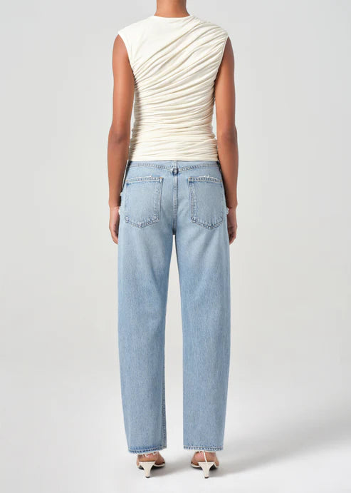 mid-rise is designed to sit relaxed on the waist with an eased up fit through the hips, finished with a loose, straight leg.