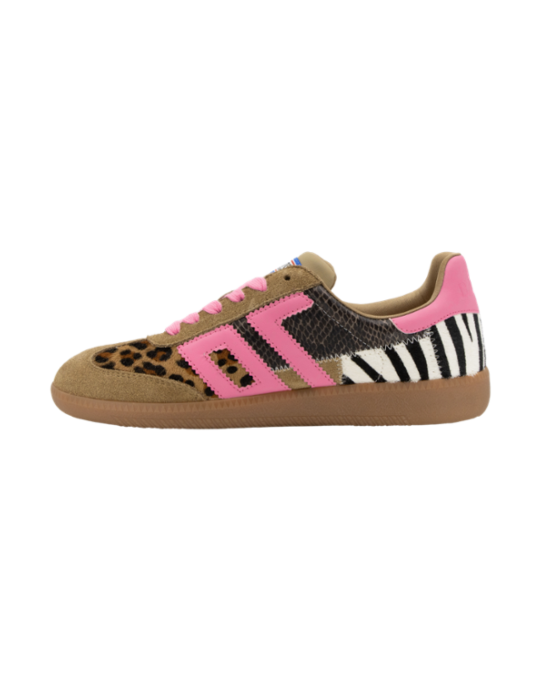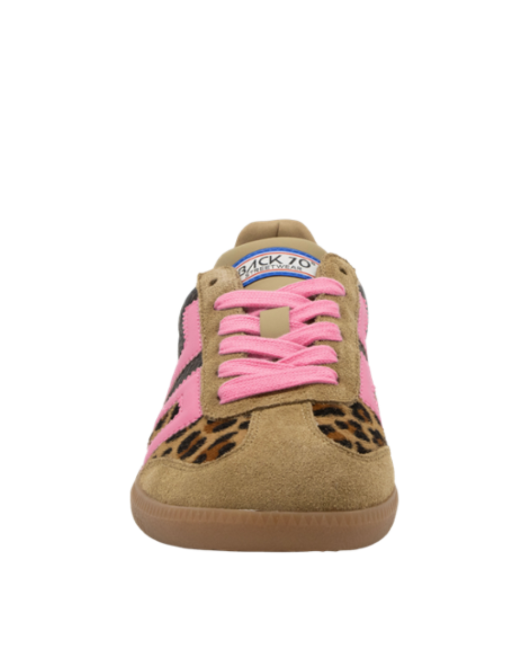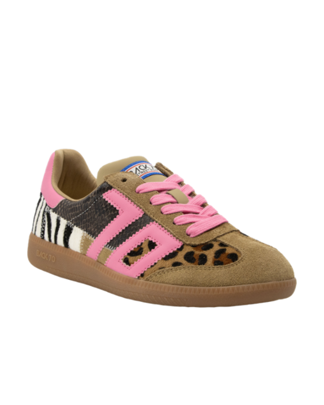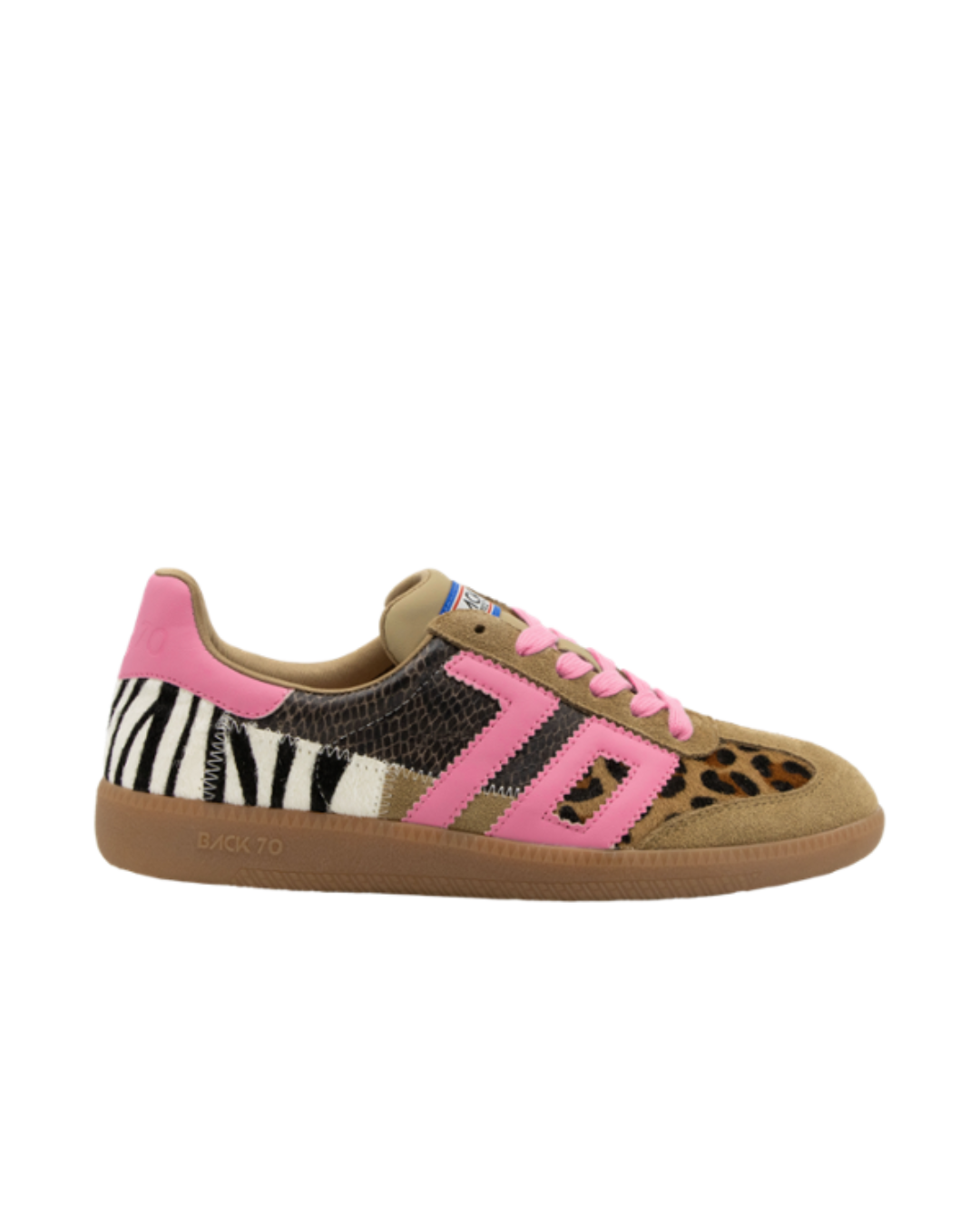 Step into bold style with the Back 70 Squid women's sneakers. Featuring a striking animal print patchwork in rich leathers and accented by the signature vintage icon in bright lipstick pink, these sneakers deliver a chic, edgy look. Stitched details and an easy lace-up closure ensure both durability and comfort. Embrace a statement piece designed to elevate your fashion moment with timeless flair.