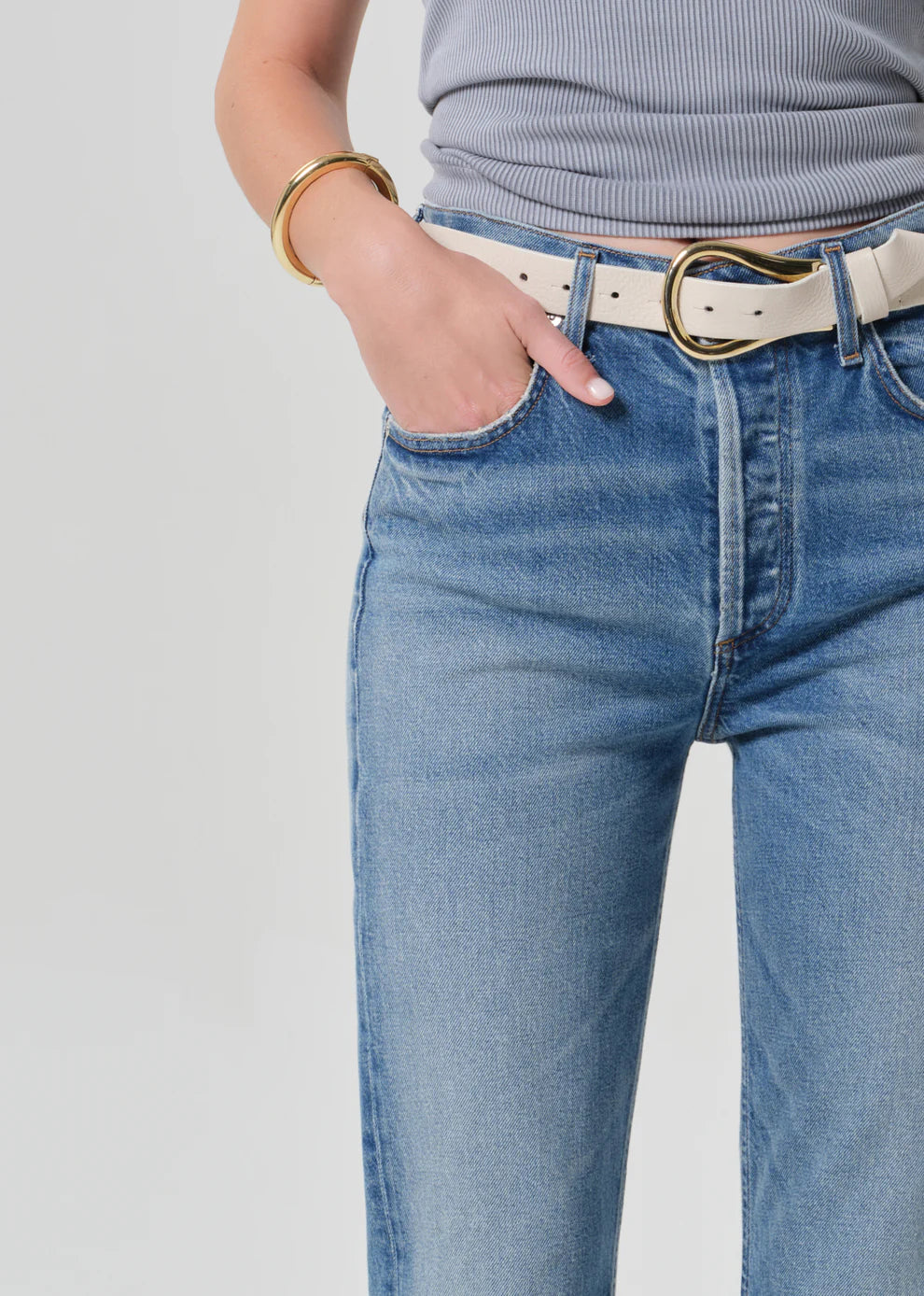 The ‘Blaine’ is a high-rise, vintage-inspired straight leg with an ankle-length inseam and effortless structure. The ‘Alma’ wash is a medium indigo with soft whiskering, crafted from bio-stretch regenerative cotton denim that’s washed down for a lightweight, ultra-soft feel. Style with relaxed tailoring or a slim knit for an elevated, everyday look.