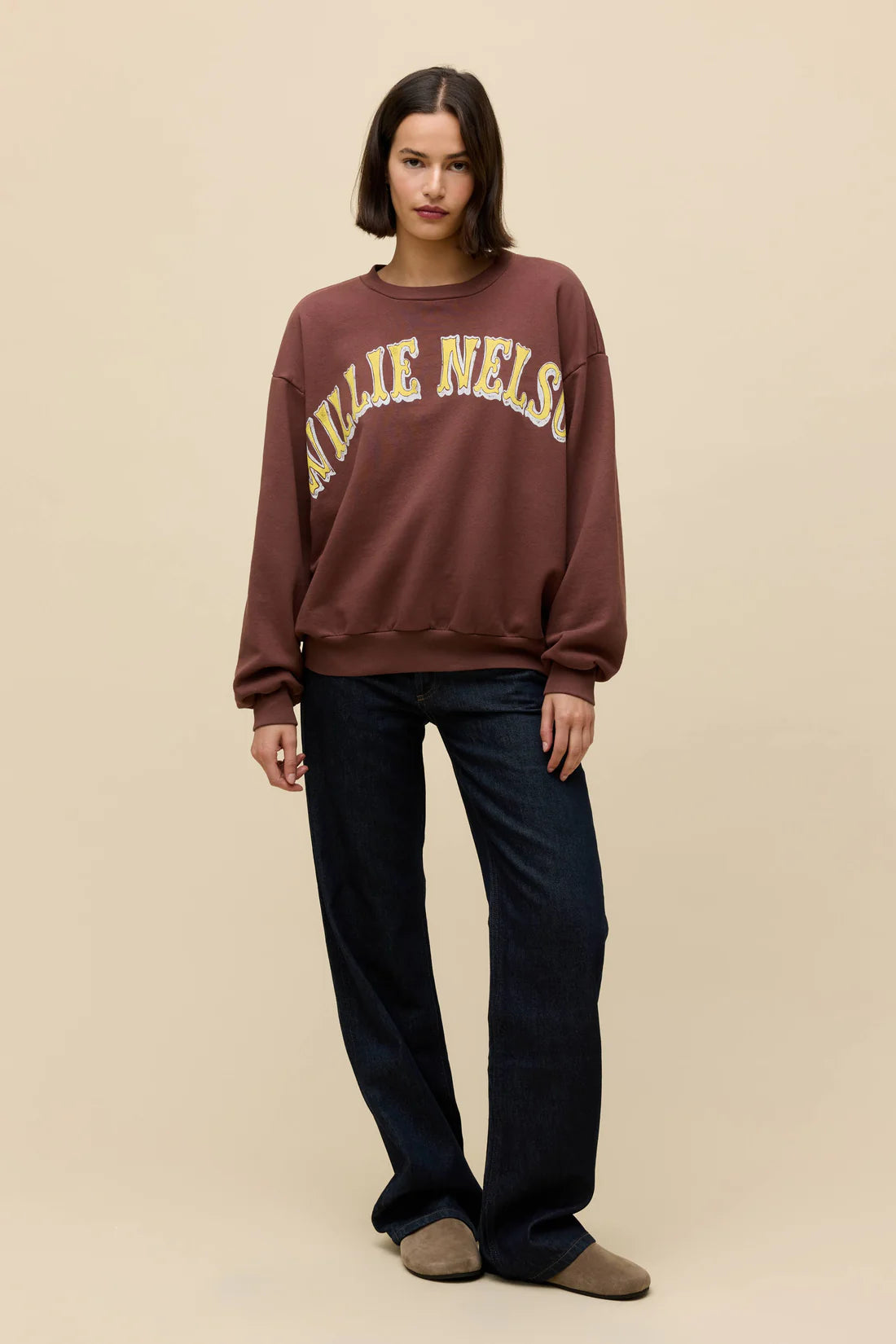 Honoring the legendary name in country, Willie Nelson lands center chest across this Oversized Crew Sweatshirt stamped with the time and place the the star's iconic track "On the Road Again" was performed live in Austin.