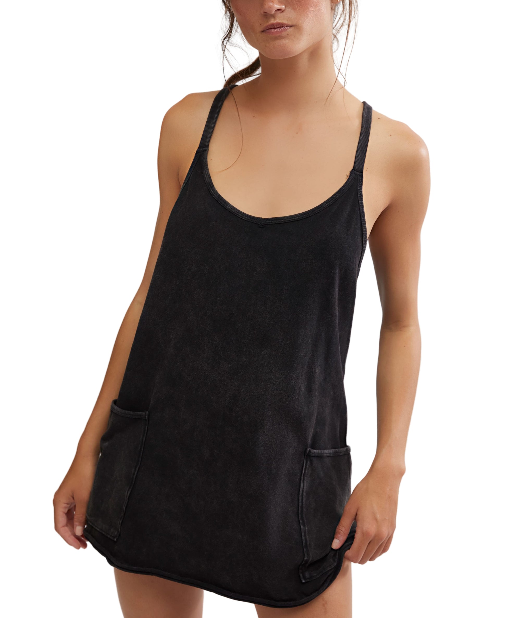 Features: Soft fabrication, lightweight design, scoop-neckline, thin shoulder straps, racerback detail with zippered pocket, oversized patch pockets at front, lined interior with shorts piecing at bottom