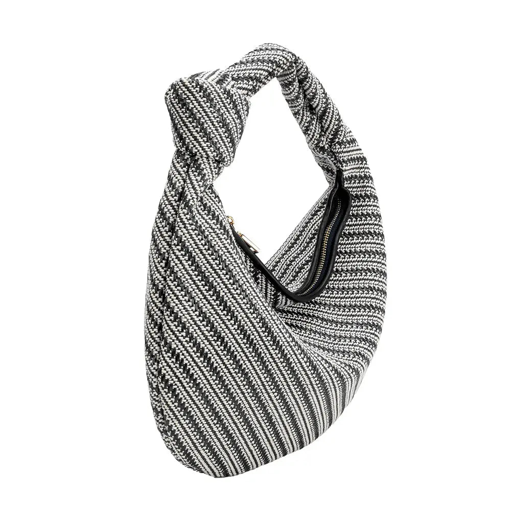 Cher shoulder bag will have you ready to enjoy warmer nights and brighter days. Trimmed with recycled vegan leather and made with lightweight raffia in a two-toned pattern. This large version can fit essentials plus a standard-size tablet. Features interior zip and slot pockets.