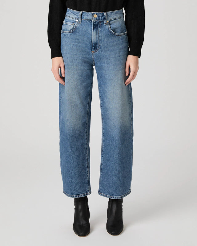 The Arellia Ankle is Paige's high-rise barrel leg silhouette with a cropped ankle-length inseam. In a soft vintage-inspired light/medium wash featuring back seams and a back trim with gold hardware, this pair is crafted from heritage-inspired denim with a soft hand-feel and a hint of stretch.