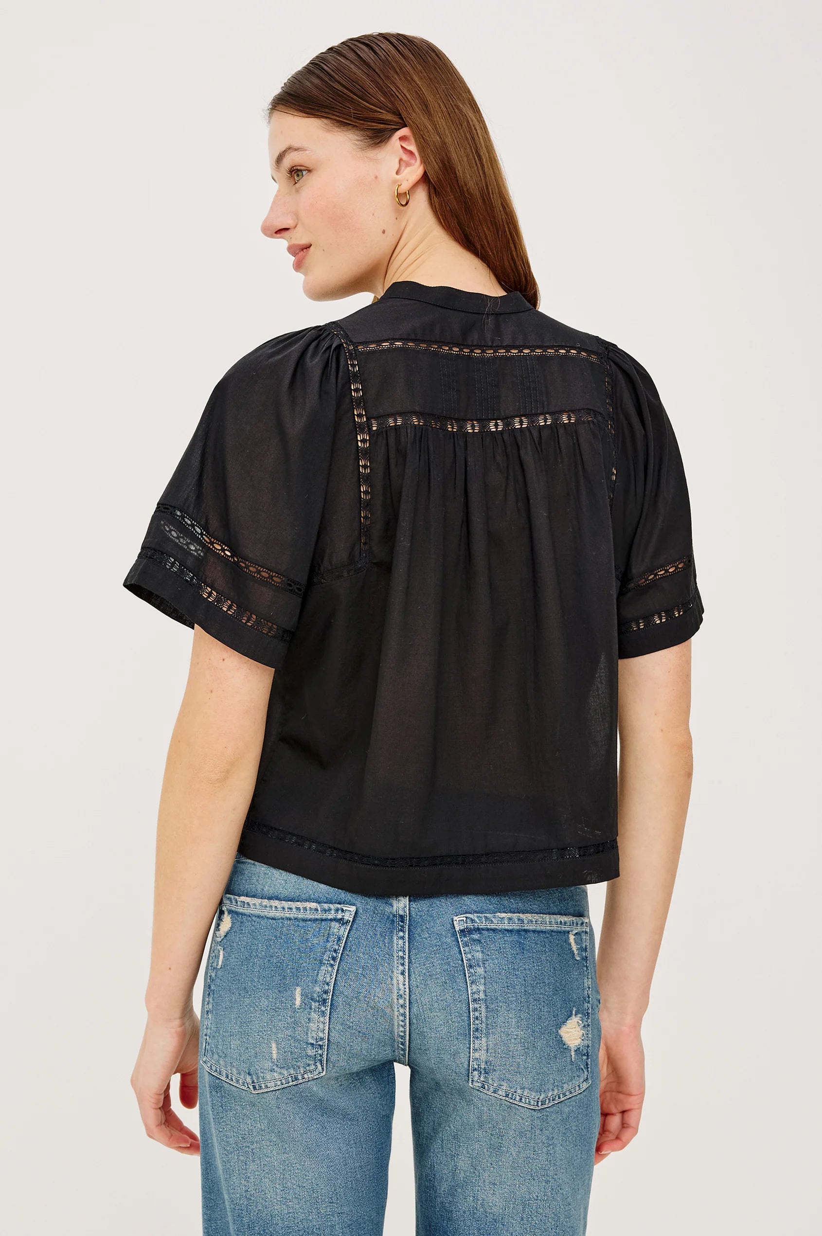 The Alanis Shirt is crafted from lightweight cotton, featuring a split band V-neckline, front button-and-loop closures, intricate lattice embroidery, and short, slightly puffed sleeves.