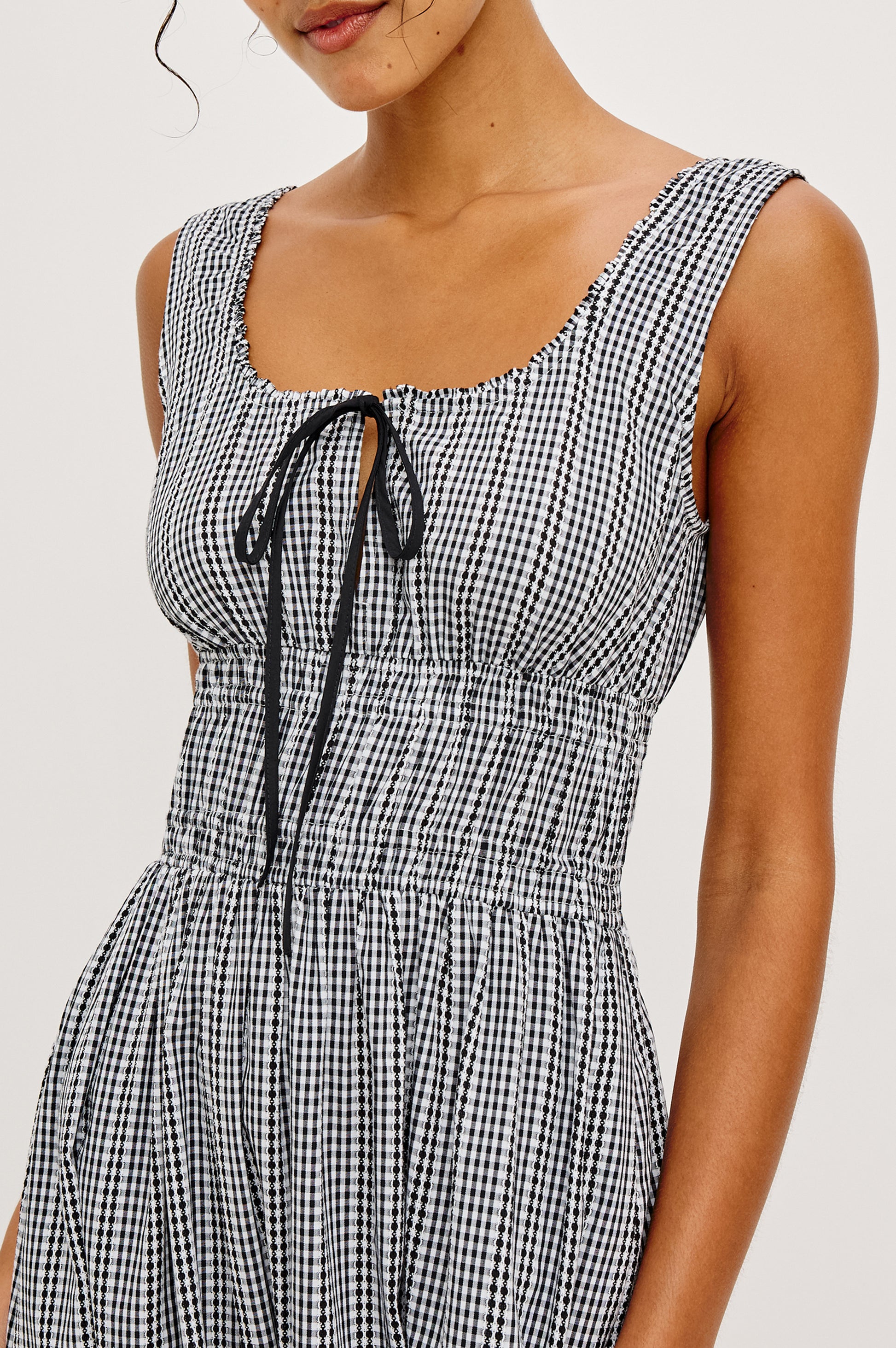 Ready to flirt, the Jordie Dress is a maxi-length A-line silhouette with a rounded square neckline, ruffle trim, center-front bust cutout with self ties, smocked waist, side pockets, and fully lined skirt.