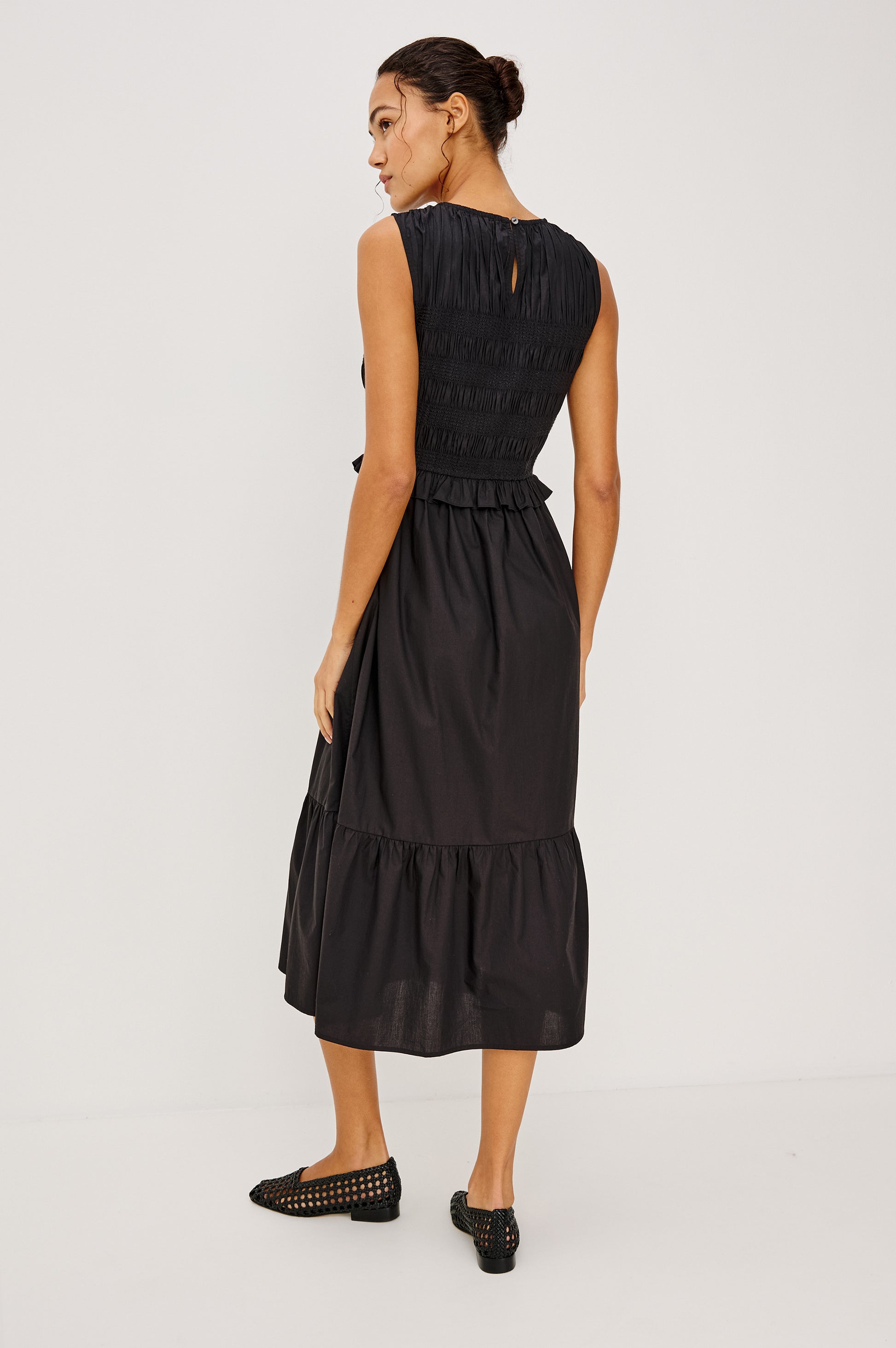 The Rialto is a tank-style midi dress in airy, lightly textured poplin, with a flattering smocked bodice, ruffle-trimmed waistline, tiered skirt, and a back keyhole with button-and-loop closure.