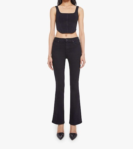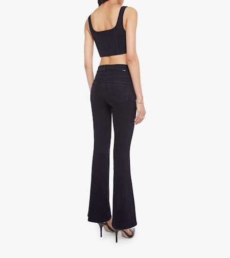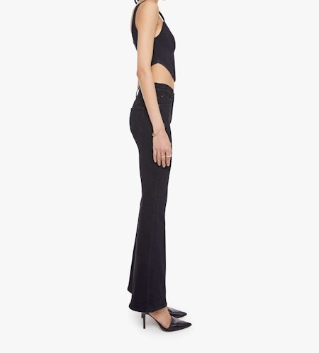 - flare jean has a mid rise with a 31-inch inseam and a clean hem. Cut from denim with a touch of stretch, Nighty Night is a dark black with tonal hardware.