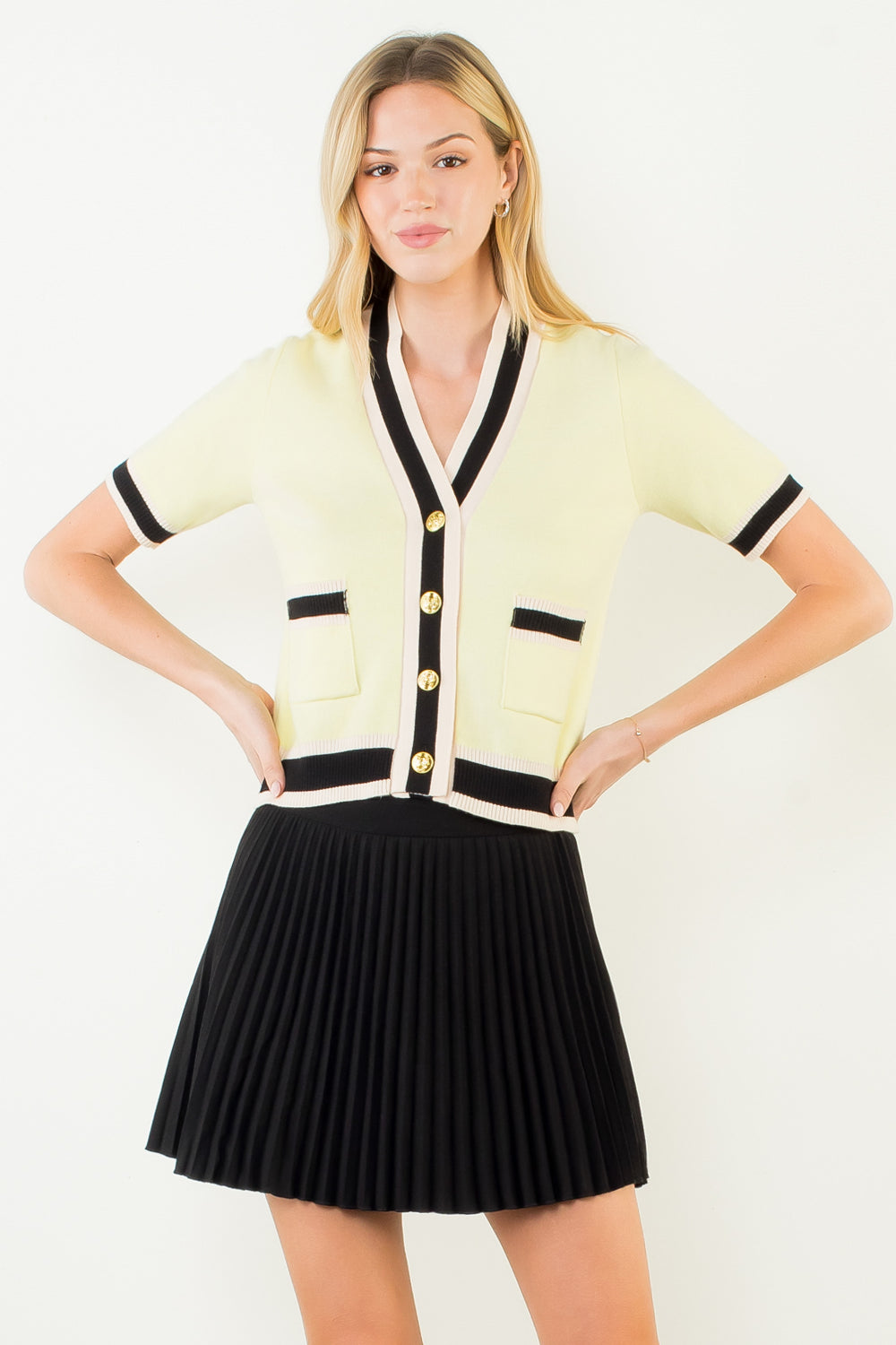 Effortless layering meets polished style with this THML short sleeve button down cardigan. The classic silhouette features a structured fit and functional buttons for versatile wear—dress it up over a blouse or down with a tee. Yellow with black lining adds a sophisticated pop of color when worn. Perfect for transitional seasons and professional settings alike.