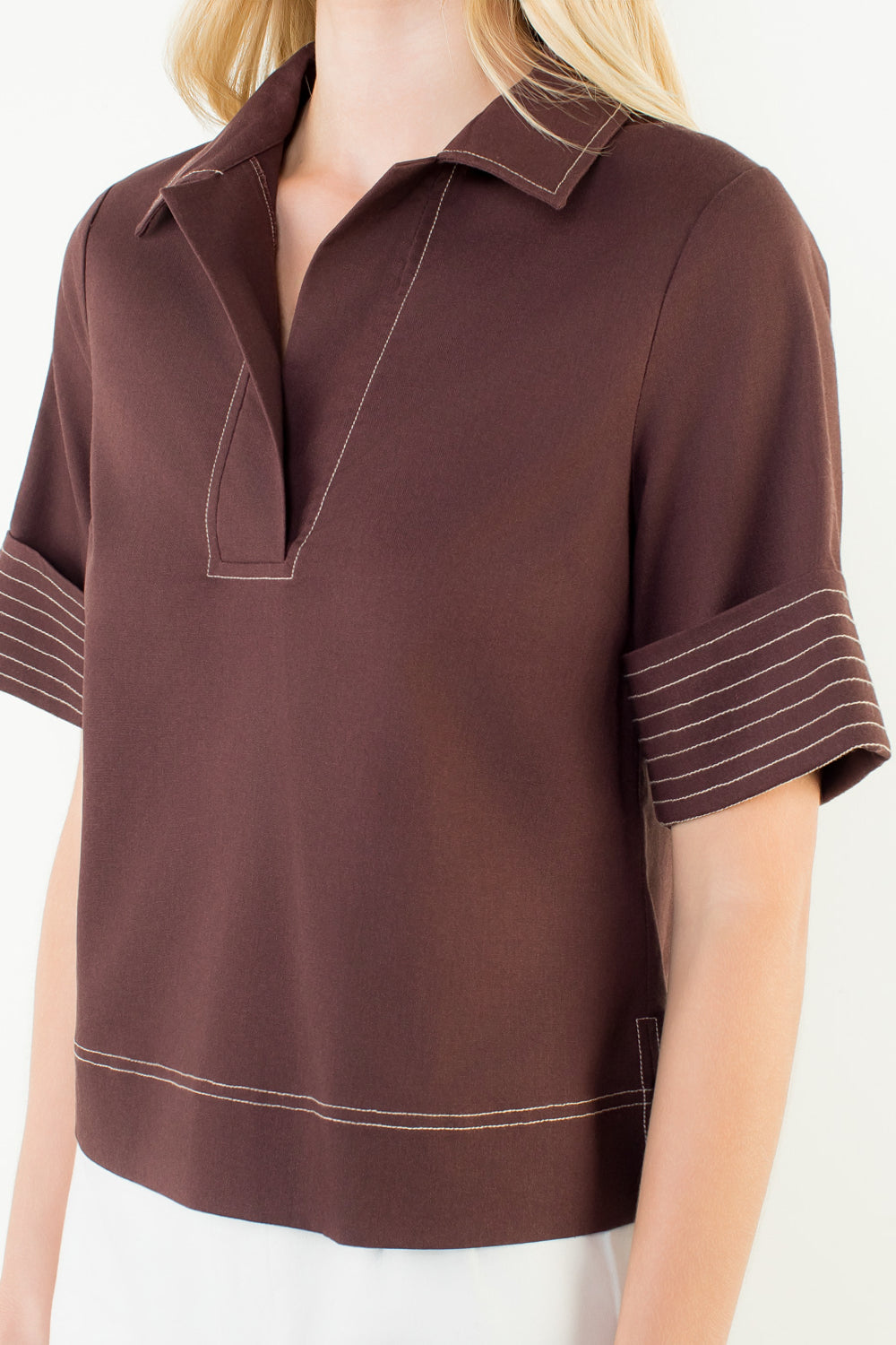 THML Short Sleeve Collared VNeck Top in rich brown with contrasting cream stitching details. This versatile piece features a classic collared neckline and V-neck cut for a refined silhouette. The short sleeves make it ideal for layering or wearing solo during warmer months.