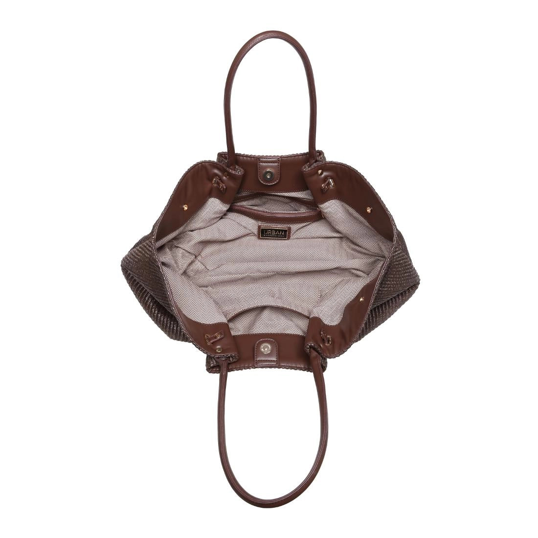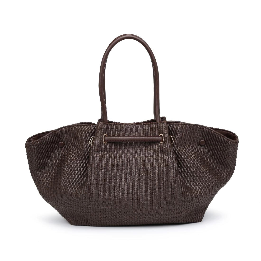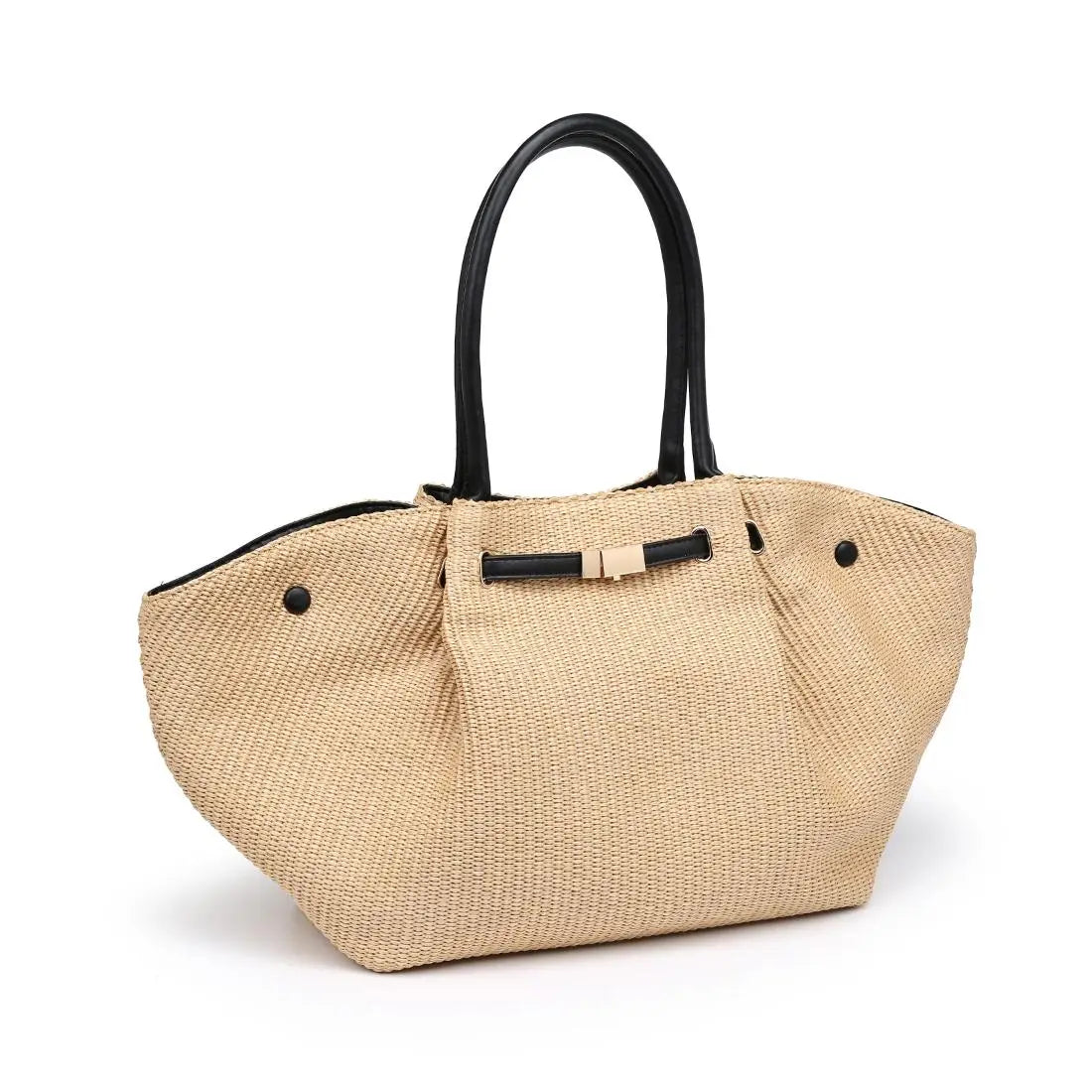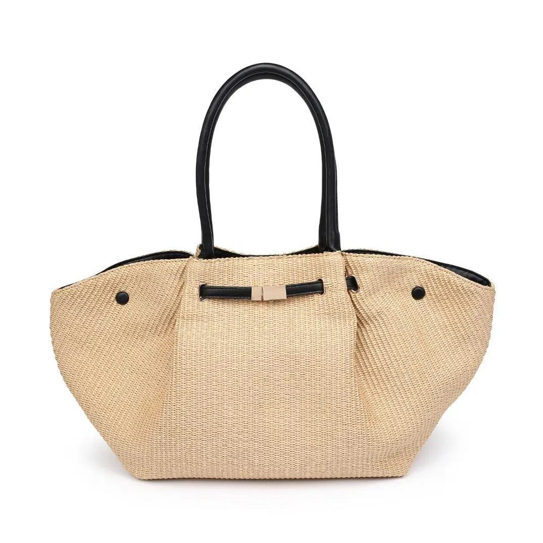 Kaia Tote — a sculpted woven silhouette with a polished bar accent. Roomy, structured interior holds laptop, wallet, essentials, long shoulder straps for comfortable carry. Snap-side design reshapes the profile, sleek hardware adds modern polish.