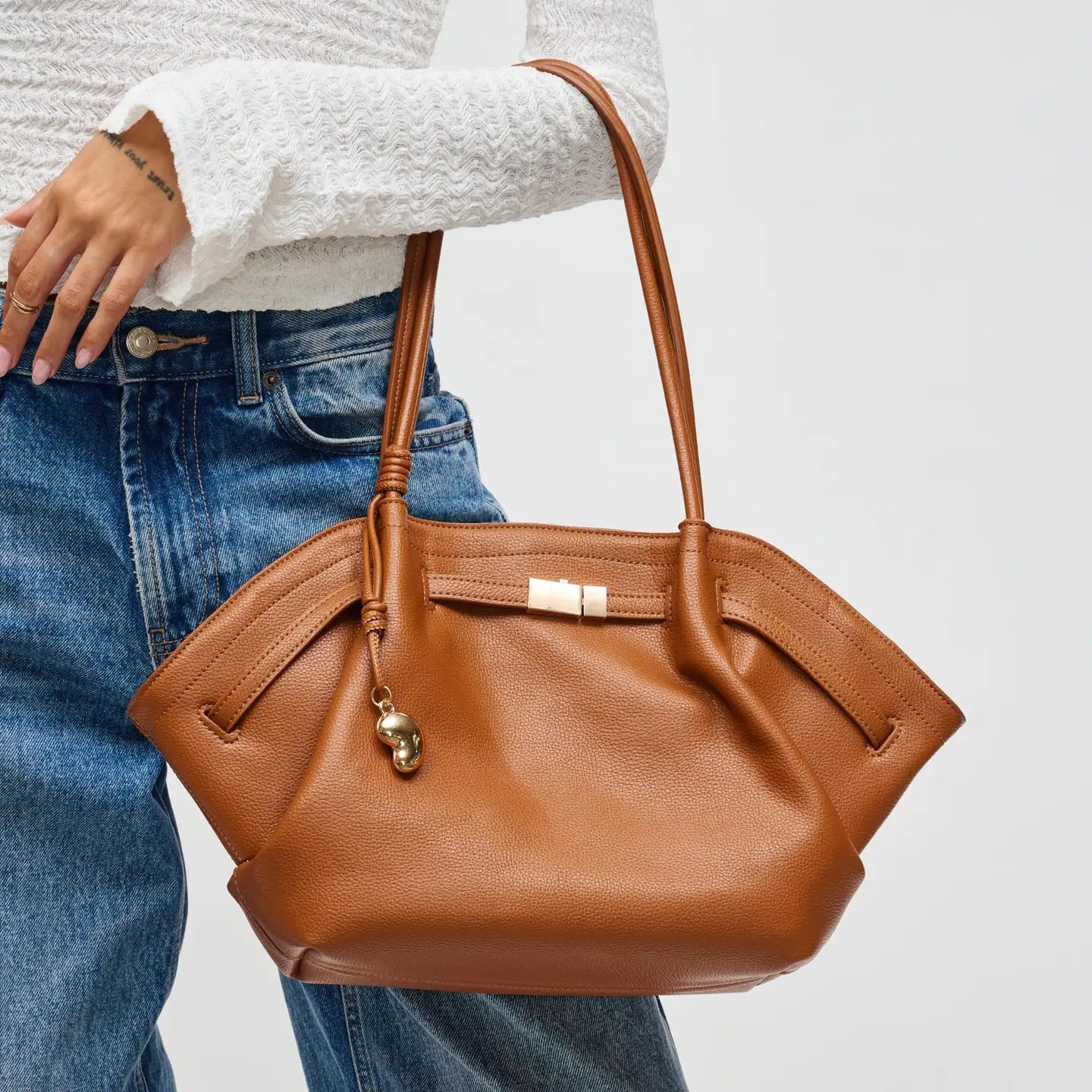 Designed for both style and practicality, the Monroe Tote is a closet essential. Its vegan leather construction is complemented by gold hardware, dual straps, and a belted detail. From running errands to meeting friends or heading to the office, the roomy interior with pockets and a removable pouch makes it your go-to carryall.