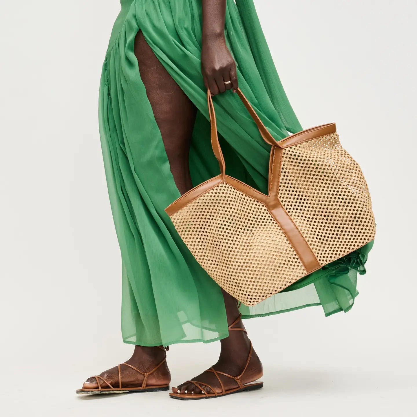 Naida Tote — airy woven silhouette with a sleek V-panel. Roomy, lightweight women's woven tote, designed with long shoulder straps and a structured top for easy access. Includes a drawstring pouch for valuables and a spacious interior for laptop, wallet, sunglasses. Perfect for market days, commute or weekend getaways, versatile across outfits.